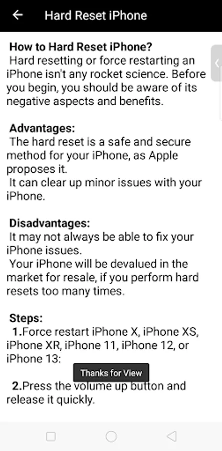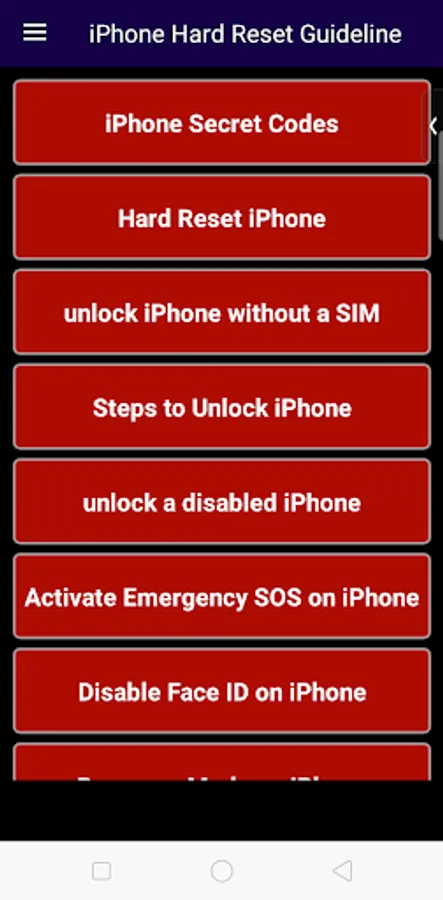iPhone Hard Reset Guideline. This app has iPhone Secret Codes, Hard Reset iPhone, unlock iPhone without a SIM, Steps to Unlock iPhone, unlock a disabled iPhone, Activate Emergency SOS on iPhone, Disable Face ID on iPhone, Recovery Mode on iPhone, How to Enter DFU Mode on iPhone, How to Exit DFU Mode