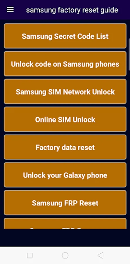 Samsung factory reset guide. This app has to Samsung Secret Code List, Unlock code on Samsung phones, Samsung SIM Network Unlock, Online SIM Unlock, Factory data reset, Unlock your Galaxy phone, Samsung FRP Reset, Samsung FRP Bypass, APN settings on an Android mobile, Samsung Mobile Set up Internet and much more. I think this app you need. We hope you find the app Useful. If You Like this App, Give it Five Stars.