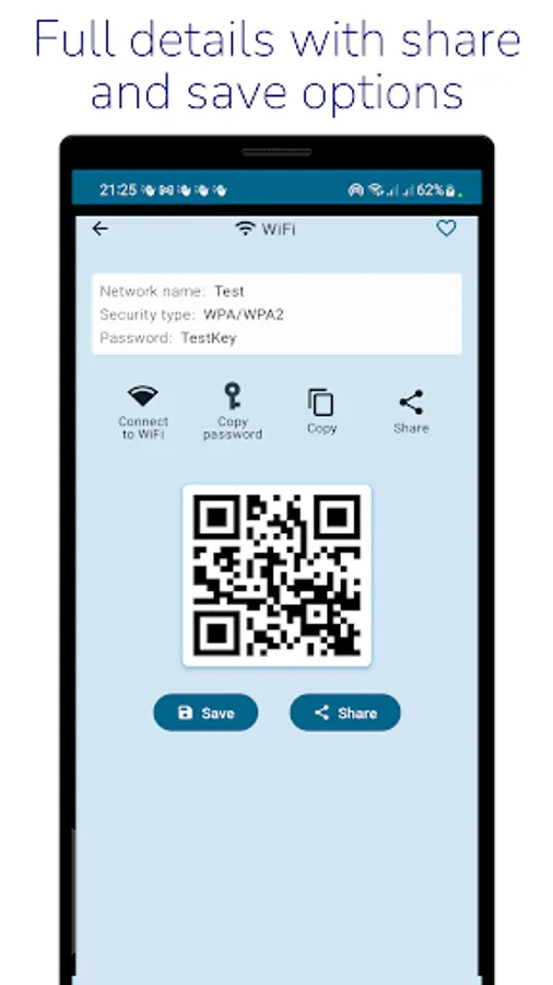 After scanning the QR scanning will provide all the information and actions associated with the Barcode result, you can share and save the result on device.
