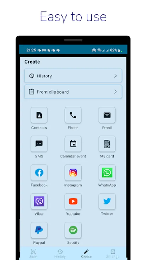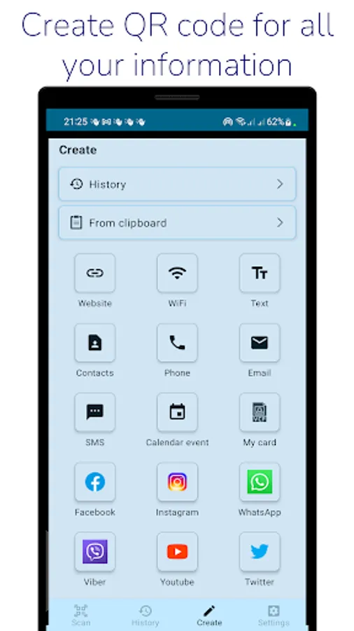 You can create any QR code for any type of information you need such as website links, WiFi password and SSID (WiFi name), Personal cards, all social media such as Facebook and Twitter, YouTube and much more.