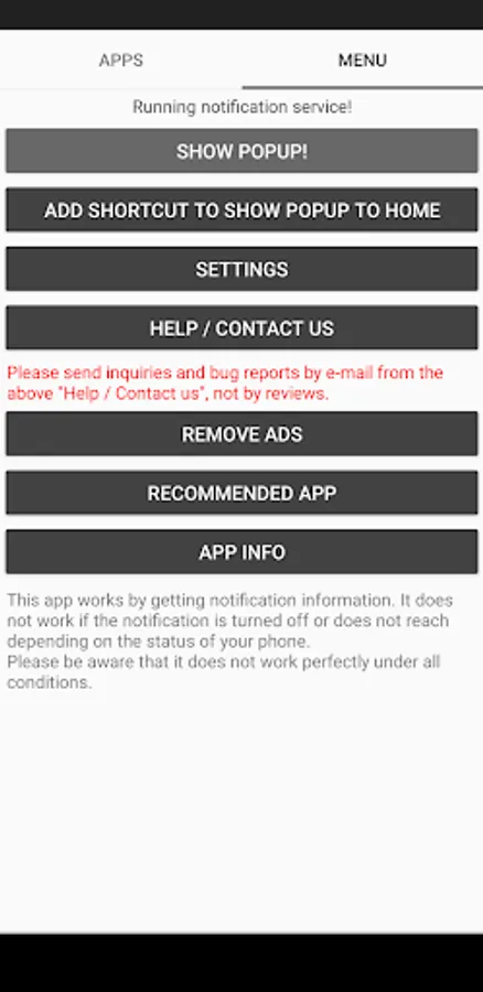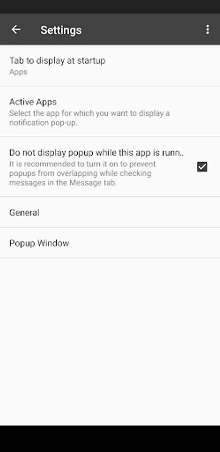 2. Go to the menu tab in the upper right corner of the main screen → Settings → "Enable Popup Apps" and check the apps for which you wish to display popup windows.