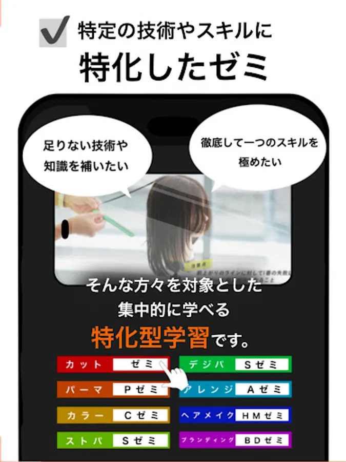 Cut seminar, C seminar (color), P seminar (perm), S seminar (straight), DP seminar (digital perm), A seminar (arrangement), HM seminar (hair and makeup), BD seminar (branding)