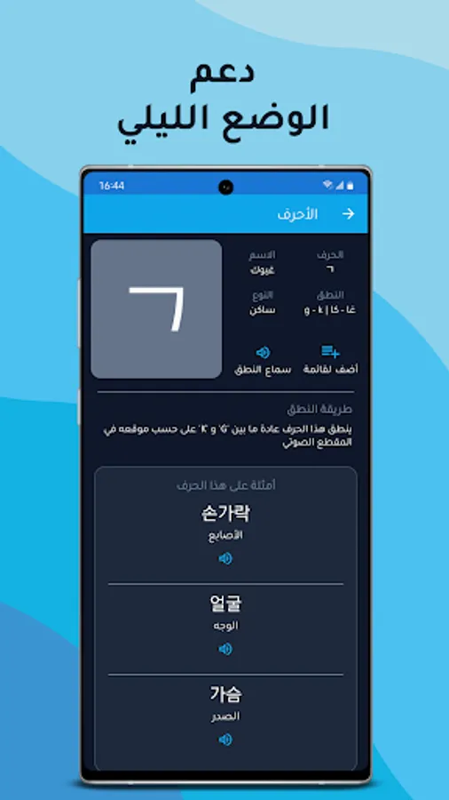 The application supports night mode in all sections to make the learning process easier in times of low light.