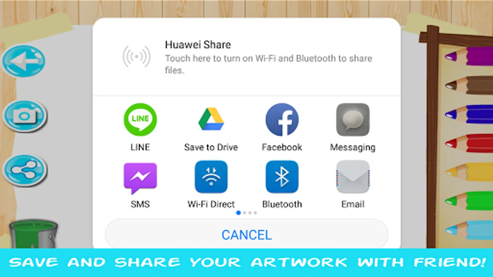 π- You can share your painting games via Social Media ,Email , Camera Roll , with family and friends.