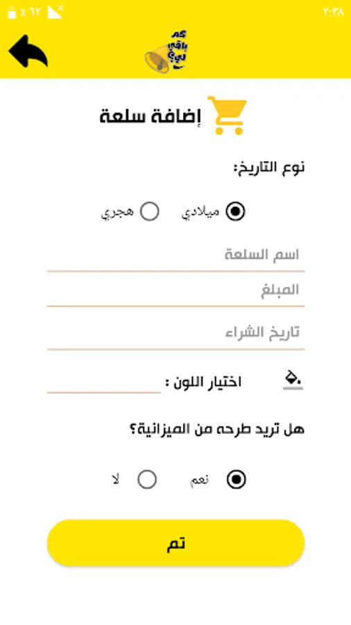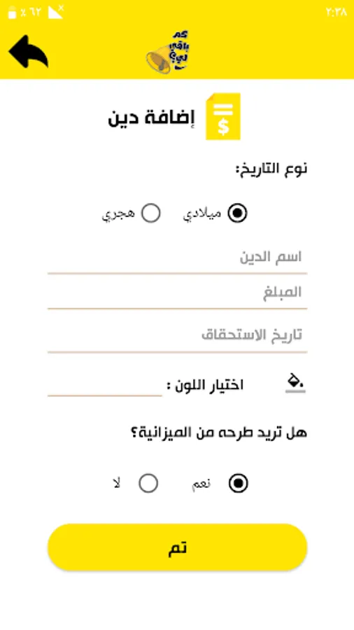 - You can add an amount as a budget or monthly salary and add debts or what you need to buy it easily and set a specific date for it with the option whether you want to subtract what you added from the budget or not