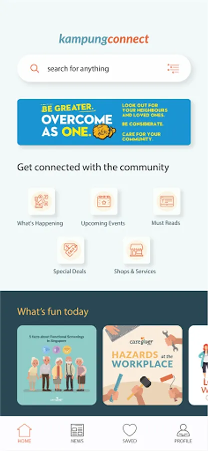 kampung connect is all about connecting dreams and connecting communities. With kampung connect, you can get in touch with your neighbourhood, check out the fun campaigns and events happening around you, read up on some tips & tricks, book services that make your life easier, enjoy exclusive promotions, and so much more!