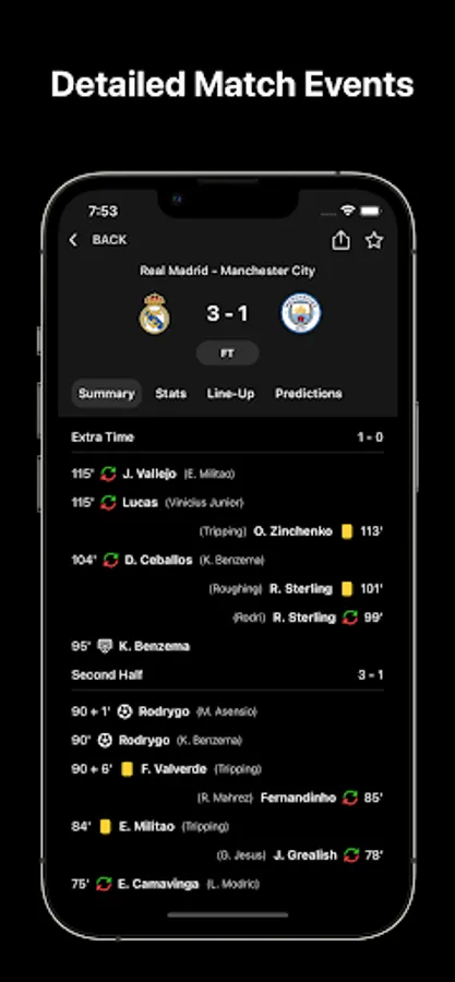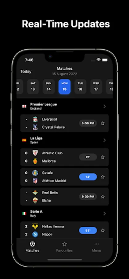 Mark your favorite matches as favorite and received push notifications of: full-time results, half-time results, kick-off, red/yellow cards