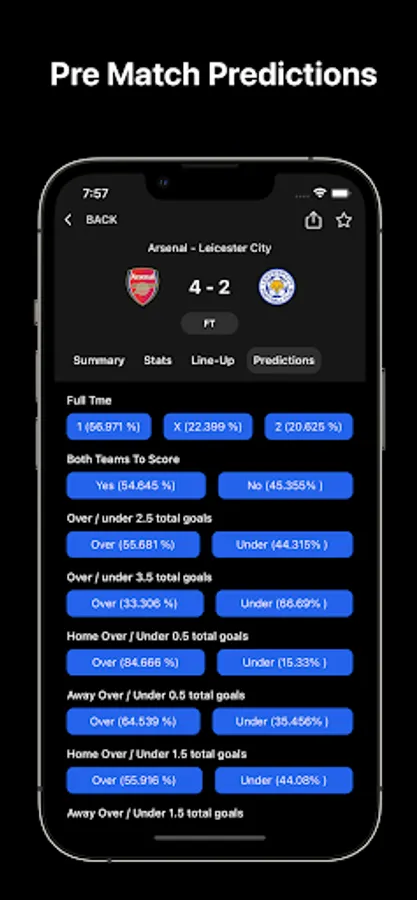 One of our unique feature in the app is that we do provide predictions about the following categories: Full-Time, Both Team To Score (BTTS), Over/Under 2.5, Over/Under 3.5, Home Team Over/Under 0.5, Home Team Over/Under 1.5, Away Team Over/Under 0.5, Away Team Over/Under 1.5