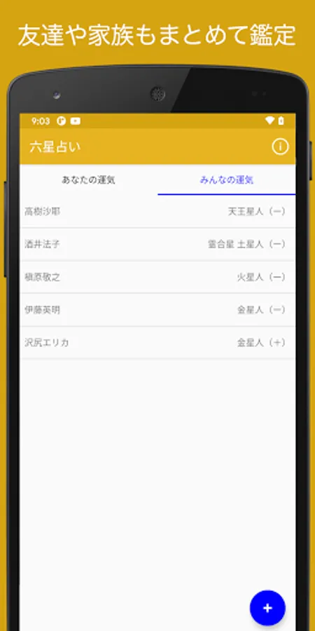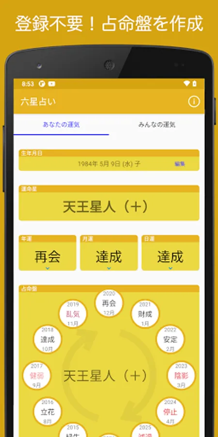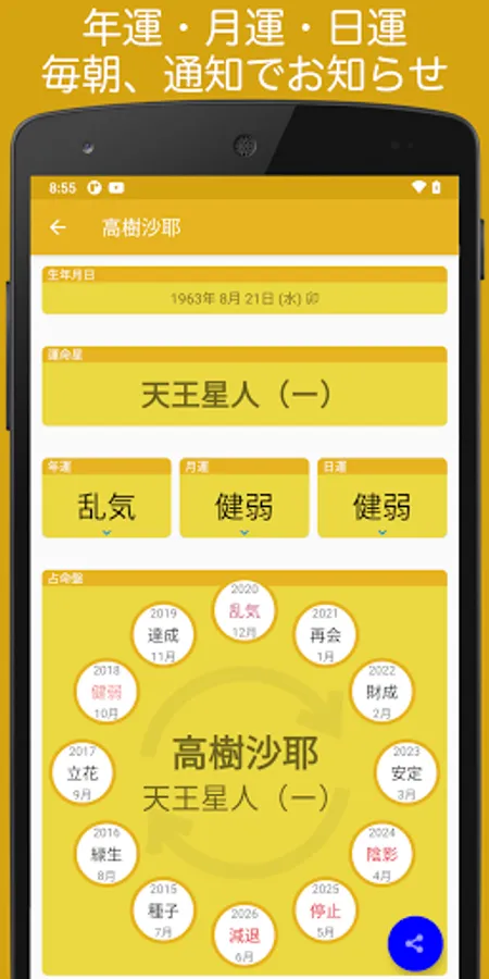 You can check past, present, and future luck (annual luck, monthly luck, daily luck).