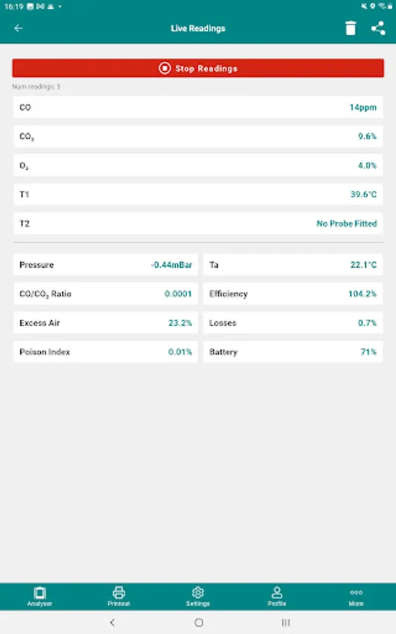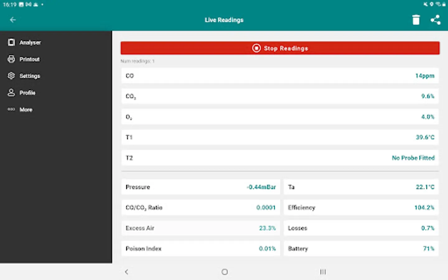 KANE Live - (FGA remote) allows you to view live readings from your KANE Flue Gas Analyser in ‘real time’. You can then share data as a CSV file via email, messaging services, cloud etc