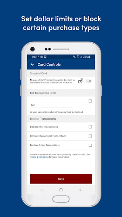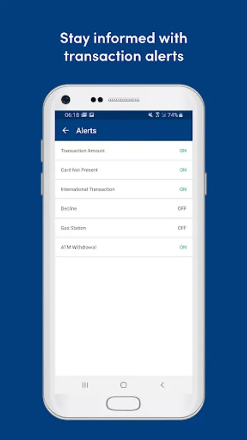 • Set alerts for ATM withdraws, gas station purchases, card declines, by transaction amount and more