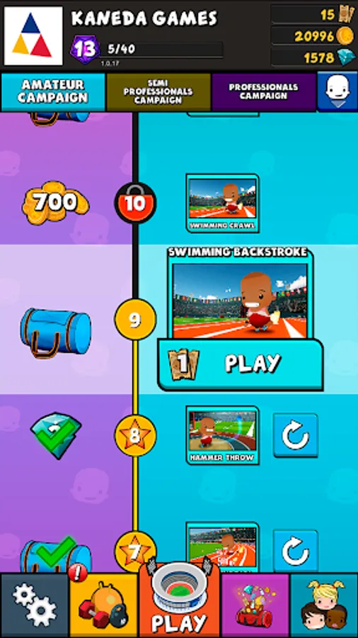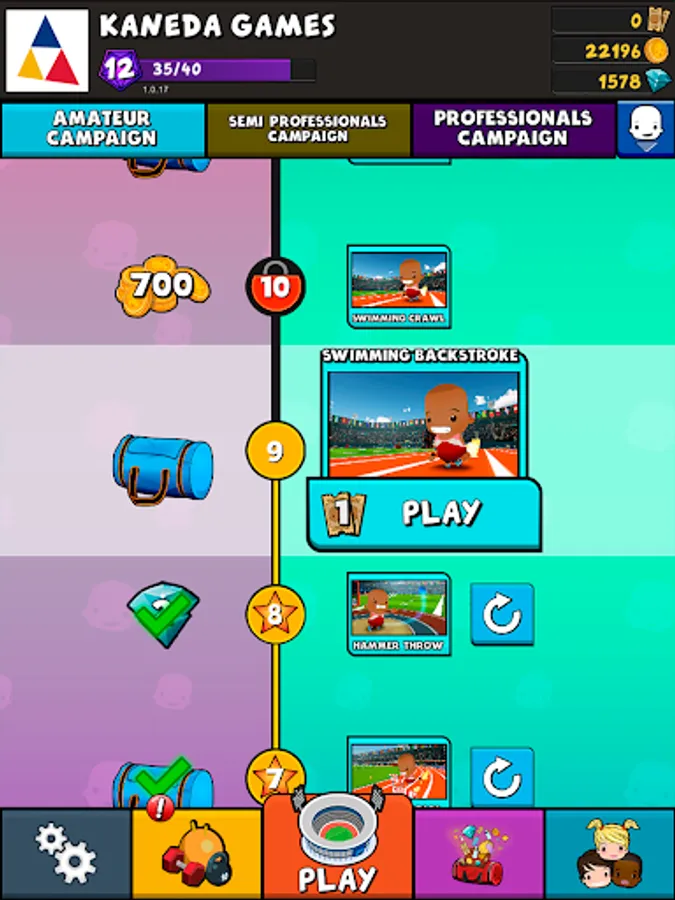 You will find athletics events such as 100m dash, 110m hurdles, long jump, high jump, triple jump, pole vault, hammer throw, javelin throw, discus throw, weight throw, swimming and many more.