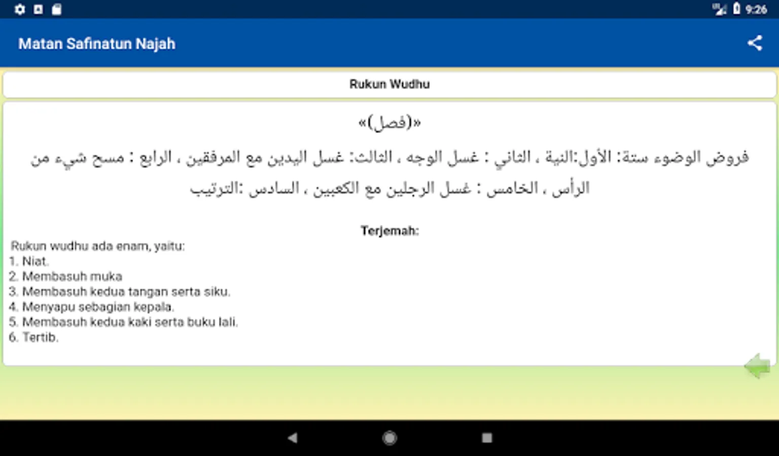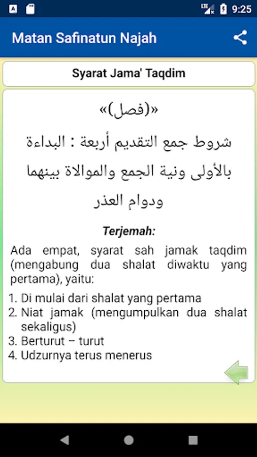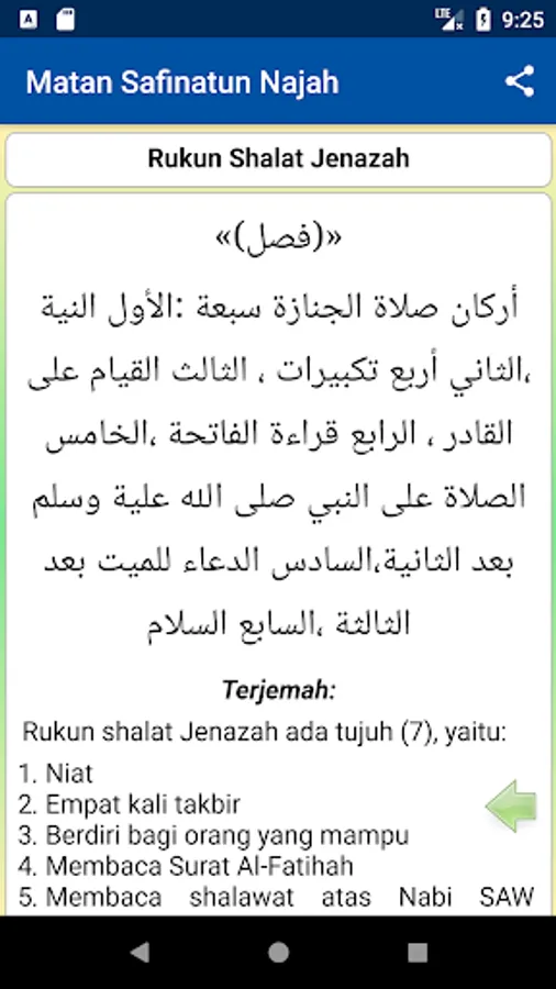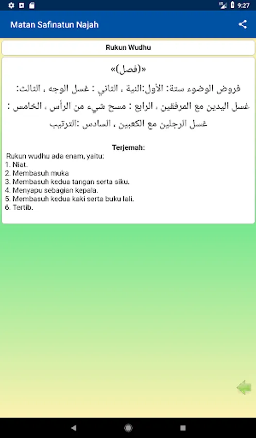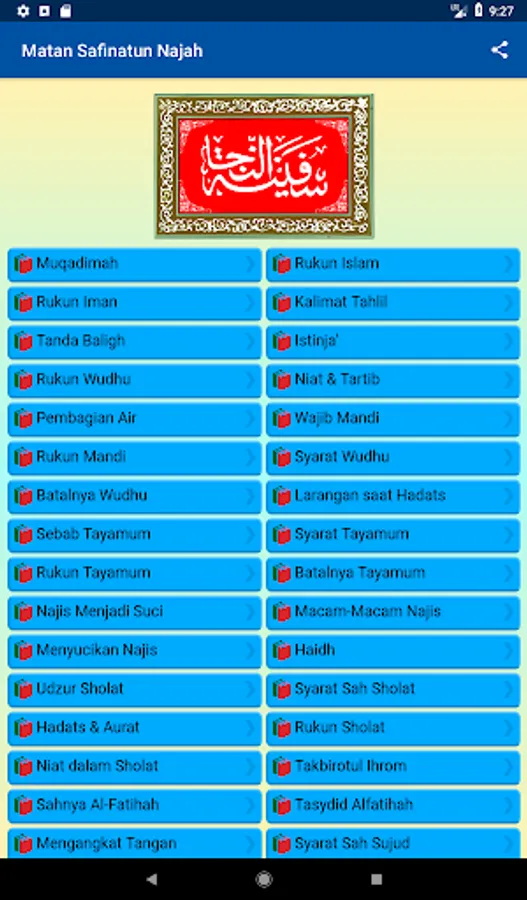 Translation of the Book of Safinatun Najah (Arabic: سفي نة النجاة) - Matan Safinatun Najah (Arabic: متن سفينة النجا) which has the full name "Safinatun Najah Fiima Yajibu` ala Abdi Ii Maulah "(boat safety in learning the duties of a servant to his Lord). A book of essays Shaikh Salim bin Abdullah bin Saad bin Sumair al-Hadrami (شيخ سالم بن عبد الله بن سعد بن سمير الحضرمي). This book contains guidance Shafi'i school of jurisprudence.