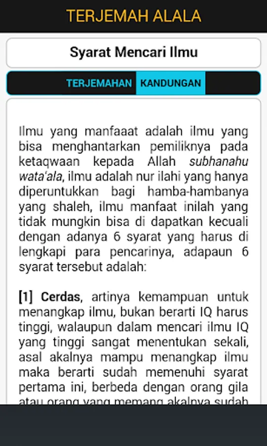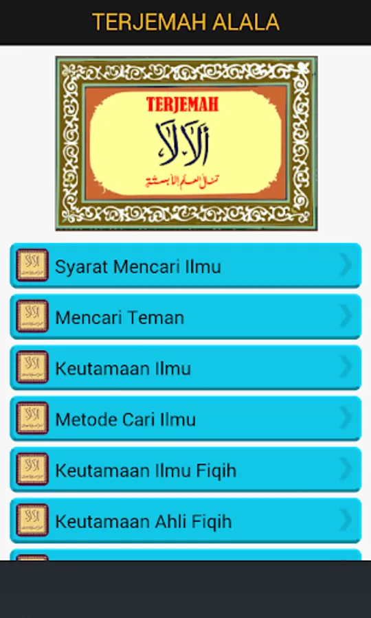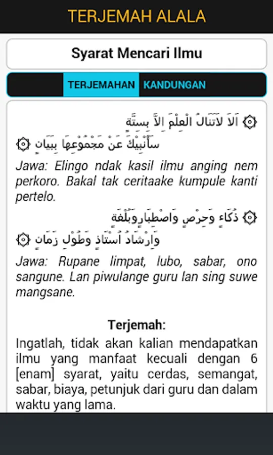 Book Alala, although physically has a simple shape, but inside there is the content of science highly. The Book that is often taught in educational diniah this basis is not only beneficial if it is read and understood by children, but everyone, from children to adults and even the elderly though, because of the meaning contained in it is so vast, in this book there is advice -nasehat about the terms in their studies, the primacy of science, the primacy of the learned, civilized society, how to find a friend / good friend, keeping oral, how to venerate the teacher, appreciate your time, be patient and try hard in search of knowledge and a variety of things , the spirit of seeking primacy of life, and others.