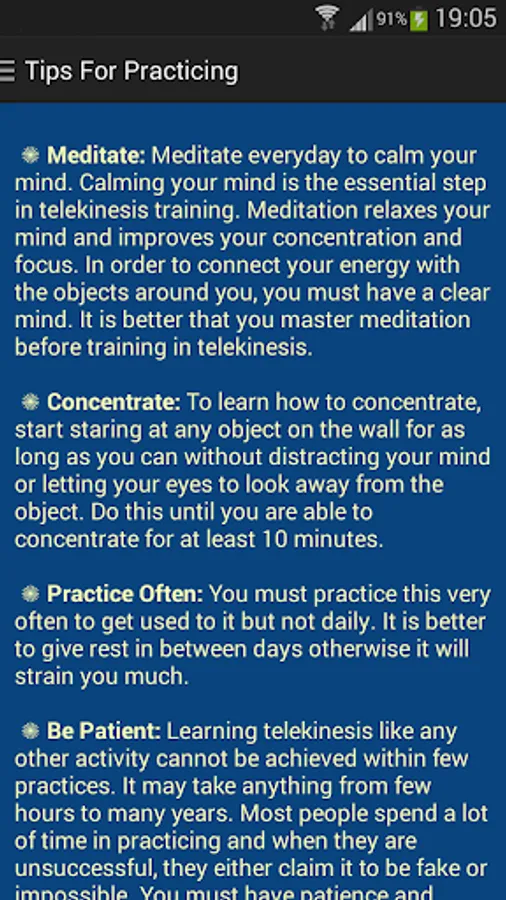 This app will properly guide you to understand and learn Telekinesis. This app provides you a step by step process to practice and evolve the skill yourself. We have shown the practices and examples with a beautiful pictures to help you for a clear understanding on the skill.
