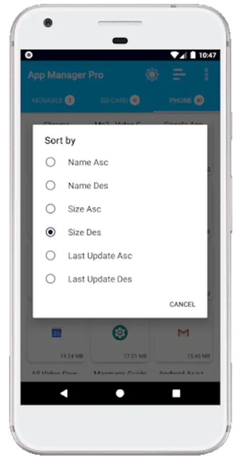 Sorting Apps : App Manager provide sorting functionality to help users to sort and manage apps.