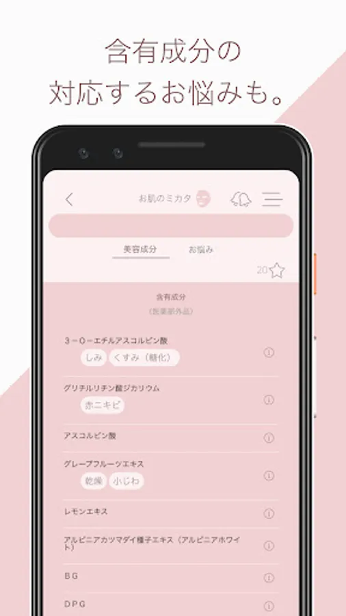 This is because it has a "ingredient" database and a "product" database for cosmetics! For example, "benzalkonium chloride", a beauty ingredient (appeal ingredient) that can sterilize P. acnes, is registered as the corresponding problem "white acne". Therefore, you can search for a product that contains this ingredient from your worries!