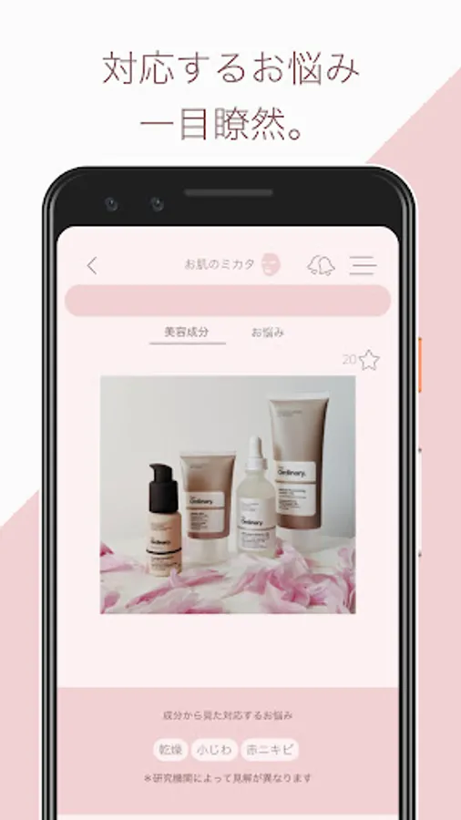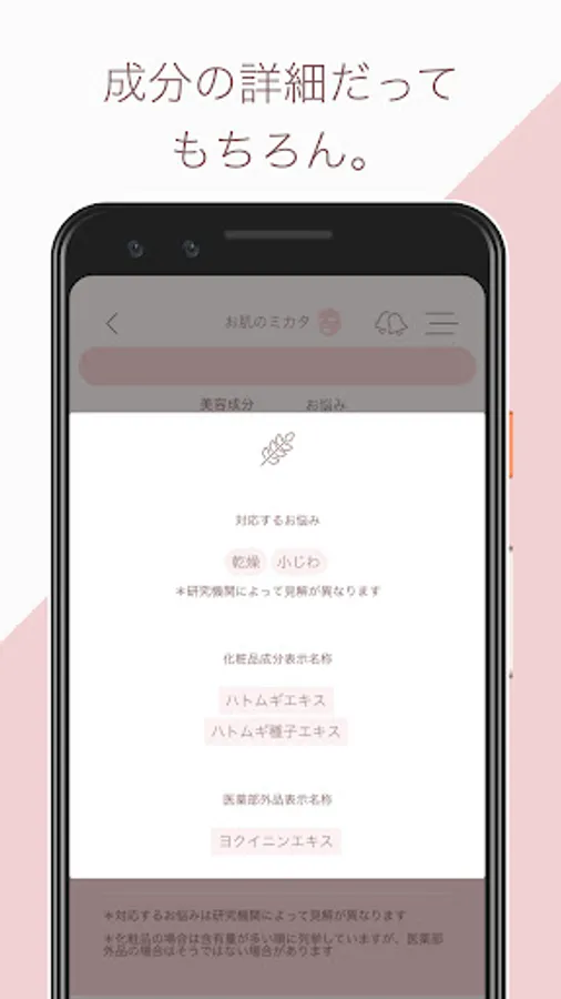 * Research on cosmetic ingredients is conducted everywhere in the world, and the research results are evolving every day. We have reflected the latest content as much as possible, but please note that some content may be out of date. In addition, please be aware that some scholars claim content that differs from the views of this app because the research results differ depending on the research institution. In addition, this app does not guarantee the effect because it only sets the corresponding worries based on the general research results.