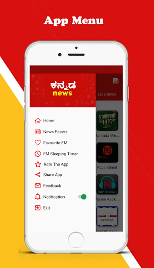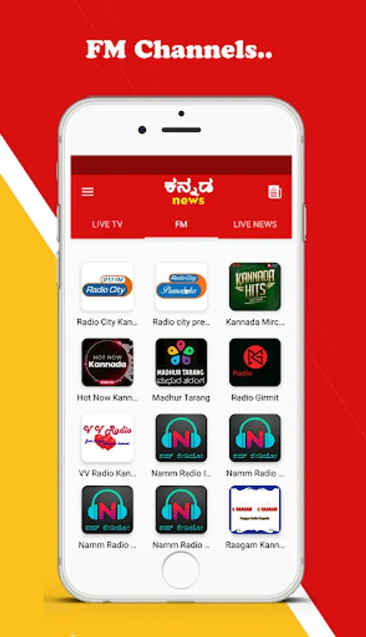 Radio City Kannada, Radio city premaloka, Kannada Mirchi Hits, Hot Now Kannada, Madhur Tarang, Radio Girmit, VV Radio Kannada, Namm Radio Indian, Namm Radio US, Namm Radio Gulf, Namm Radio Europe, Raagam Kannada, Radio Active CR 90.4, Alp Radio, Kannada Romantic, FM Rainbow, Rainbow Kamanabillu, Air Bengaluru, AIR Kannada, Vividh Bharati, Amruthavarshini Bengaluru, AIR Raagam, AIR Primary 612 KHZ, AIR Live News, All India Radios, Radio Daijiworld, Jana Dhwani, BEC Dhwani, Radio Panchajanya, Radio Sarang Kannada, ShantiRadio, Carnatic Classic, FM Ragam Carnatic, Calm Radio, Sai Vaani, Sathyatma Vani, Divyavani Sanskrit Radio, Sanathana Vani, Guru Raghavendra Radio, Quran Radio, Shalom Beats, Hand of Jesus, Jesus Coming, BIBLE 1, BIBLE 2, RMC Bangalore, Kannada Christian radio, Radio Stuthi