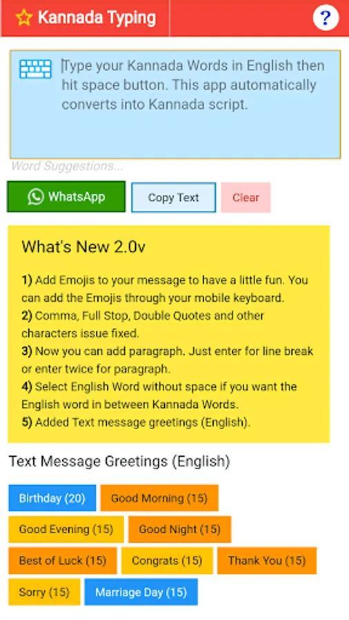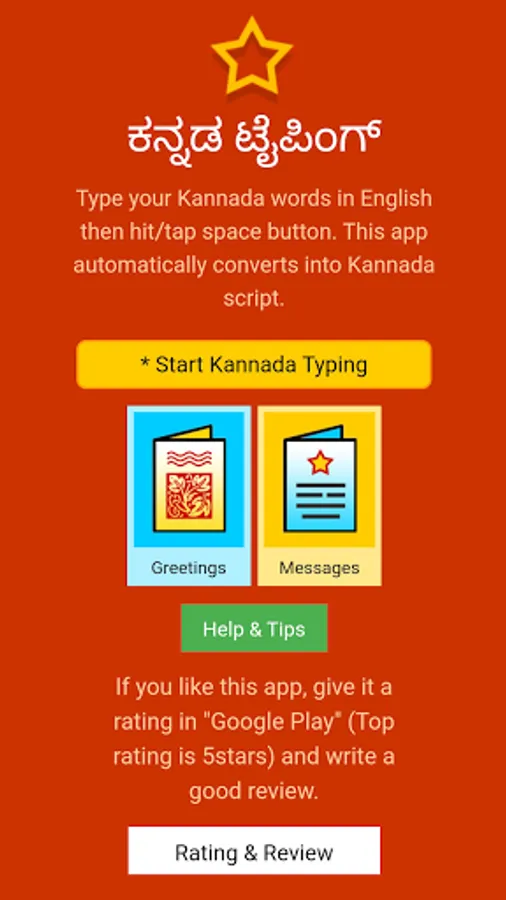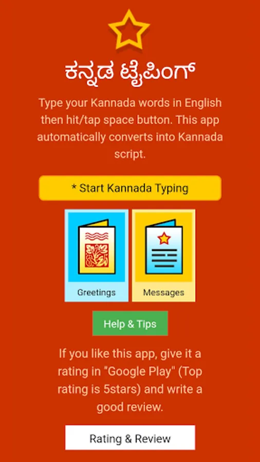 Kannada Typing (Type in Kannada) app is an English to Kannada transliteration tool. Type your Kannada words in English and hit/tap space button. This app automatically converts into Kannada script.