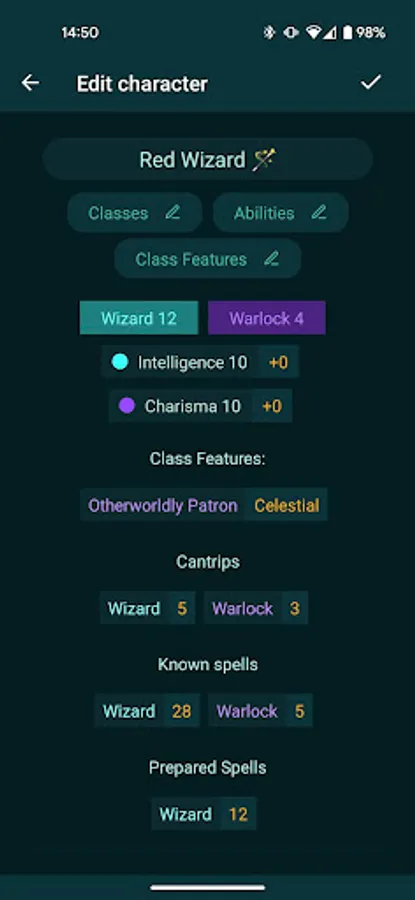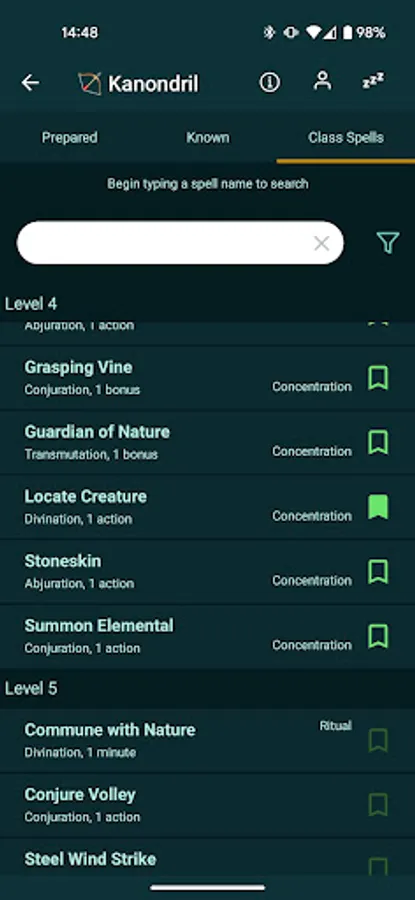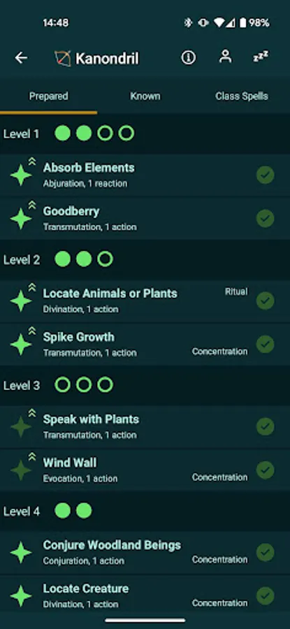 Organize your character's spells and keep track of what spells are known, what's prepared, and the spells you've cast.