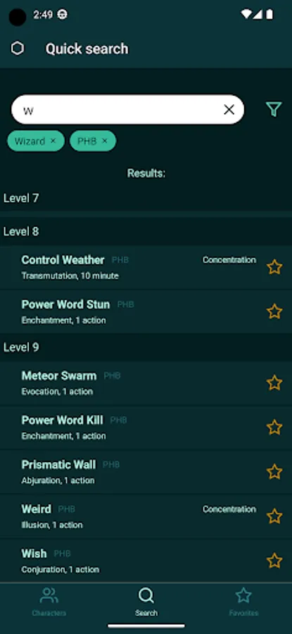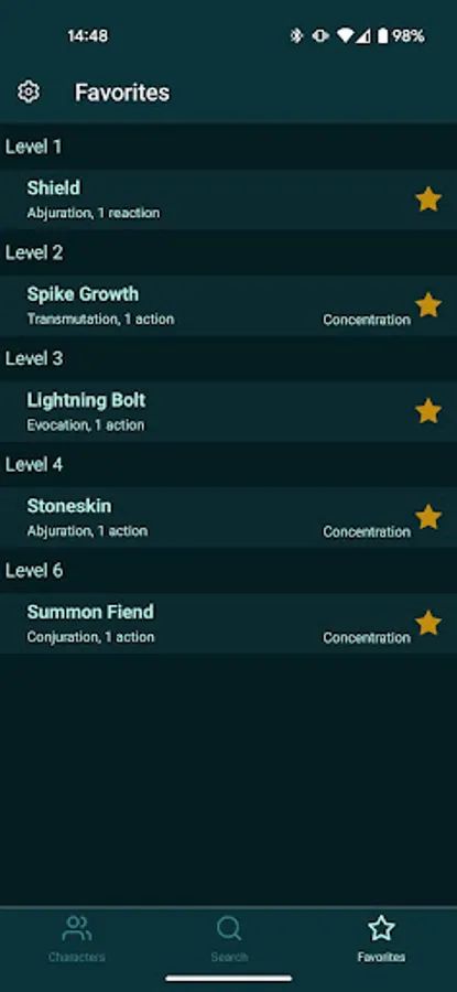 Keep a list of Favourites handy for instant access or use the Quick Search feature to browse and discover spells based on class, level, school, and more.