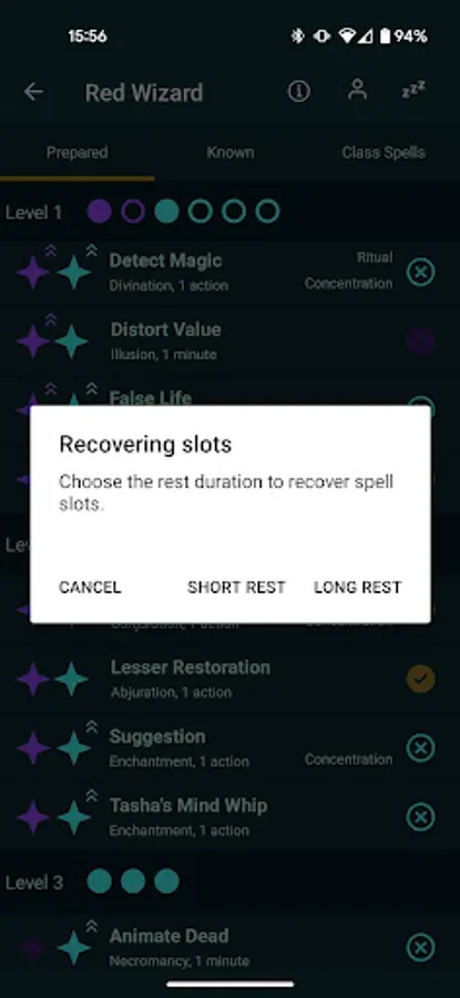 Let your character take a stress-free nap (or a Long Rest) and the app will help you restore spell slots for you for features such as Arcane Recovery or Pact Magic.