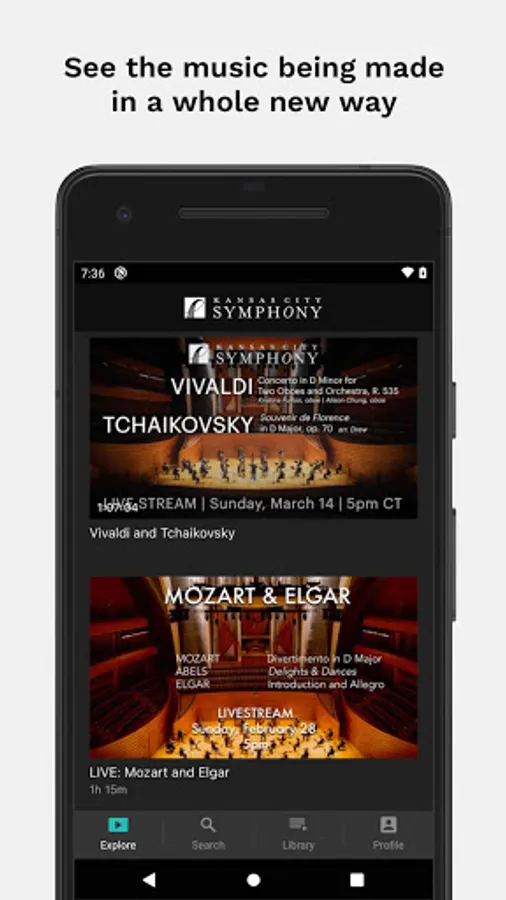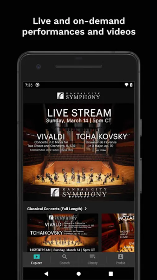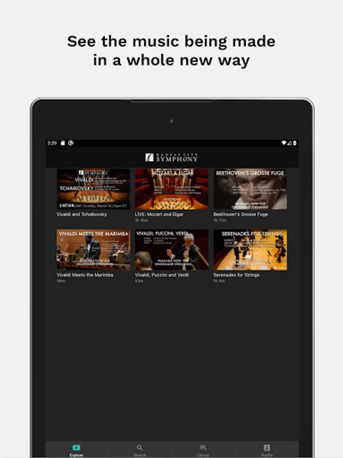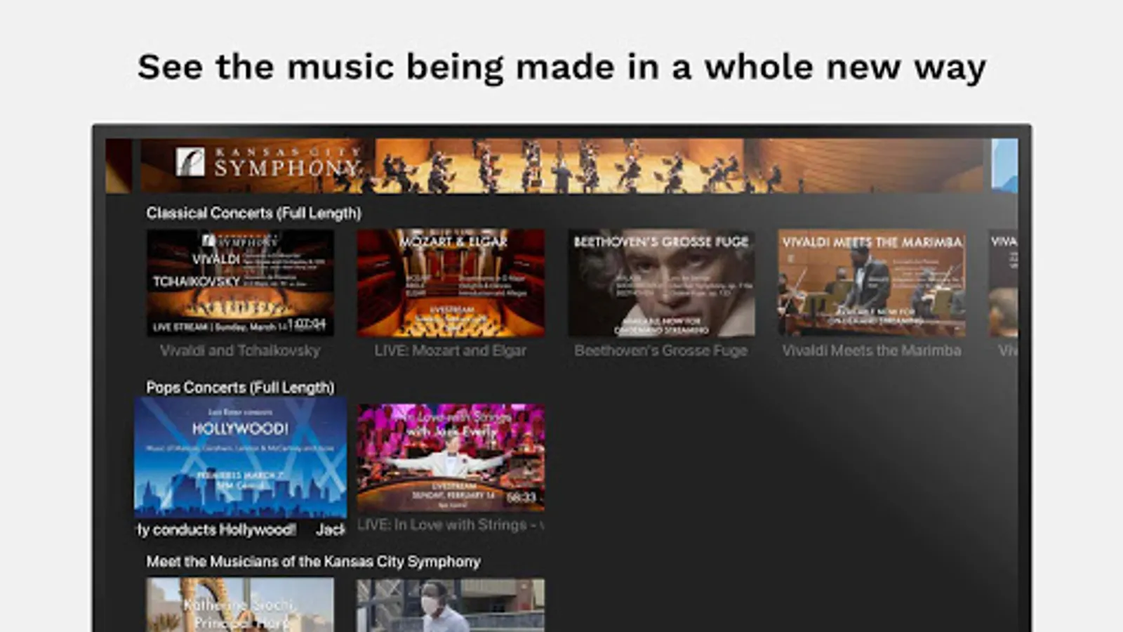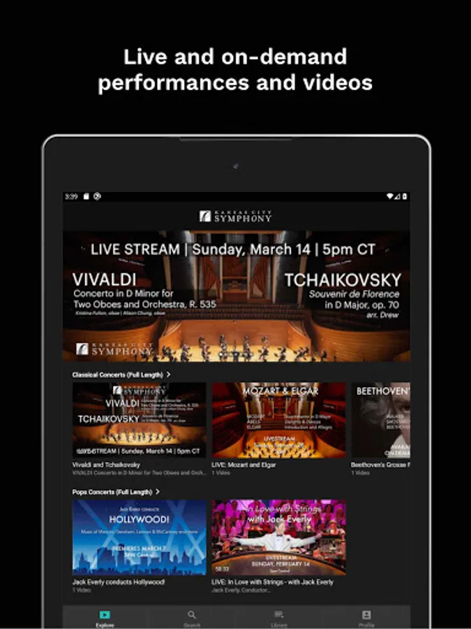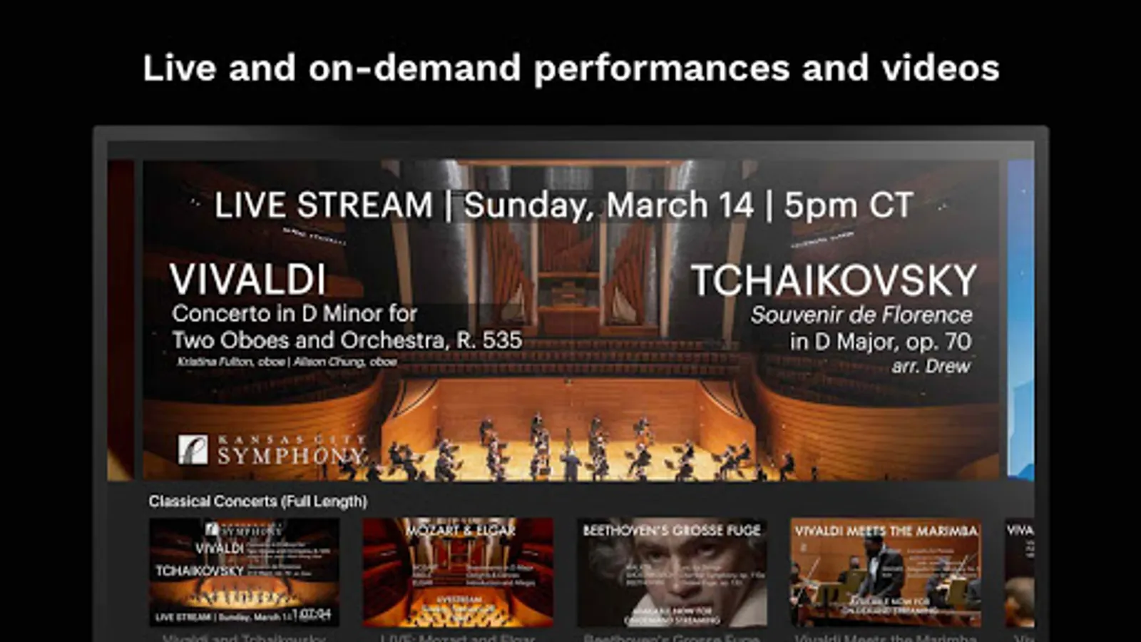 Live and on-demand performances by the Kansas City Symphony from the world renowned Helzberg Hall at the Kauffman Center for the Performing Arts. See the music being made in a whole new way - it's like sitting on stage with the orchestra. See the musicians in ways you never have before, and experience the best of music orchestral music from wherever you may be.