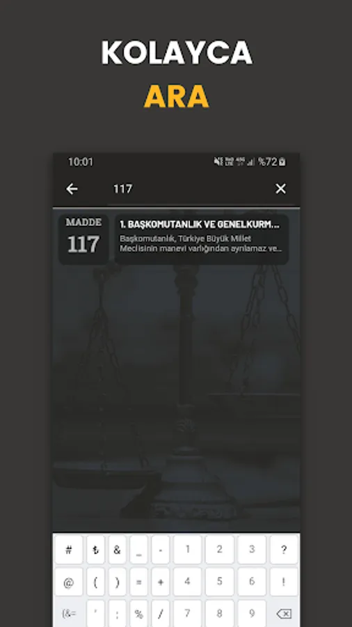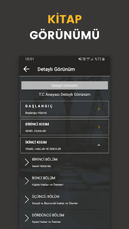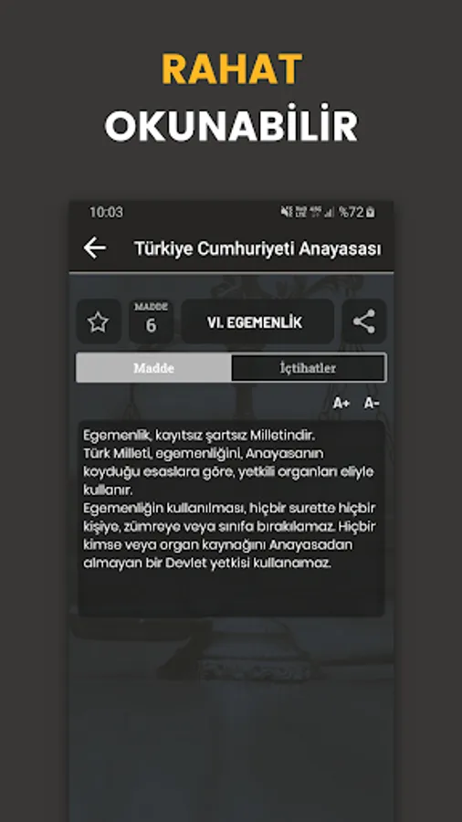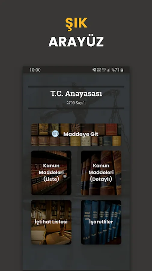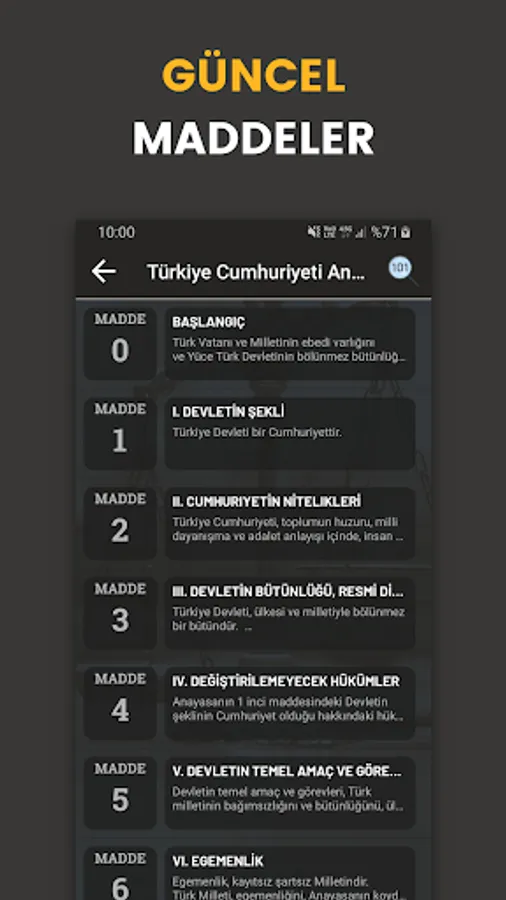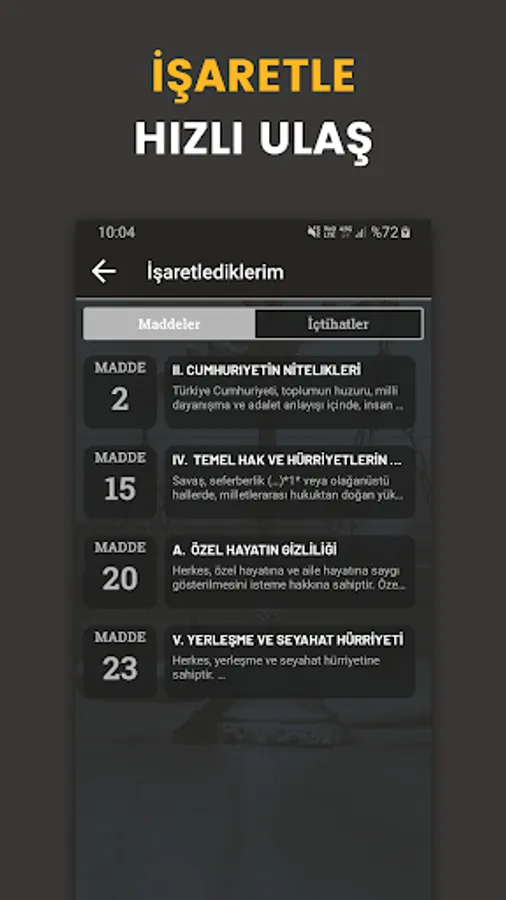 This application can access with the Constitution of the Republic of Turkey No.2709 an easy and convenient way, you'll easily reach their laws and jurisprudence related matter in detail and can be seen as substance list.