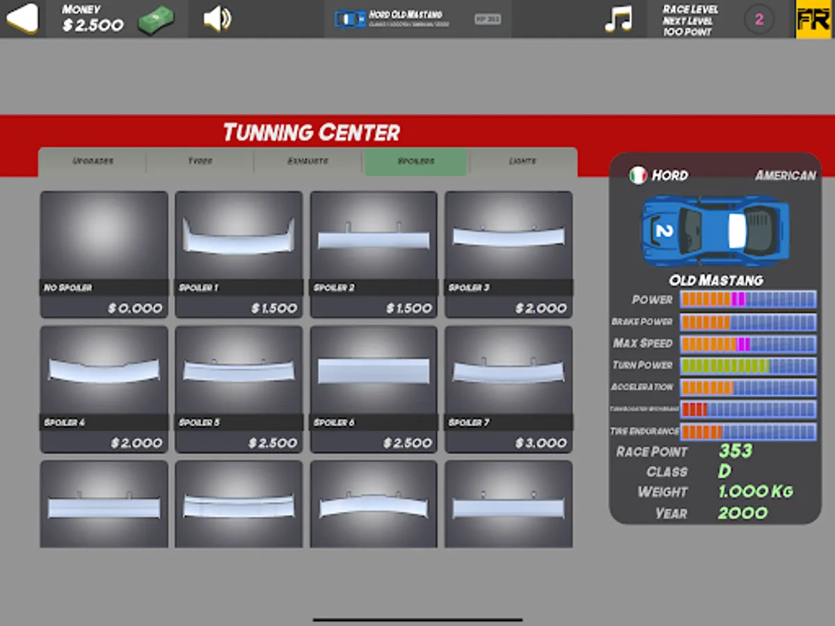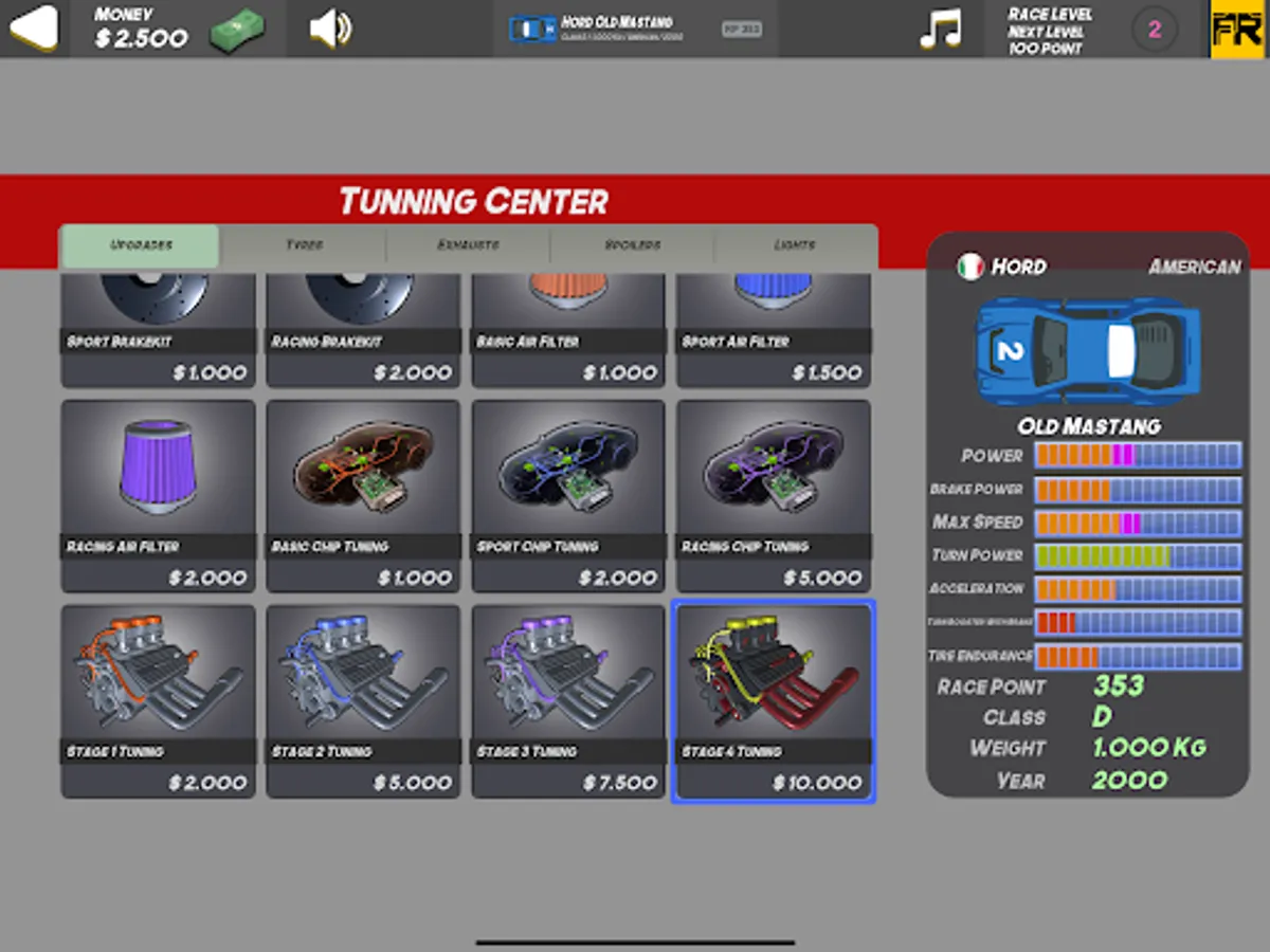 You can increase the power of the car you purchased. You can increase and change many features of the car such as taking off speed, braking power, maximum speed, turning power. If you want, you can attach personalized parts to your car such as exhaust, wings and lighting.