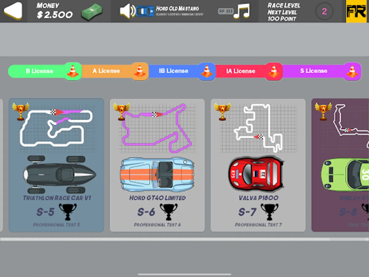 There are 5 licenses in total B-A-IB-IA-S. Each license has 8 different stages. In order to participate in the races, you need to get your driver's license first!