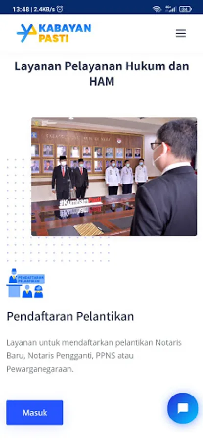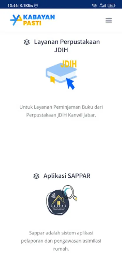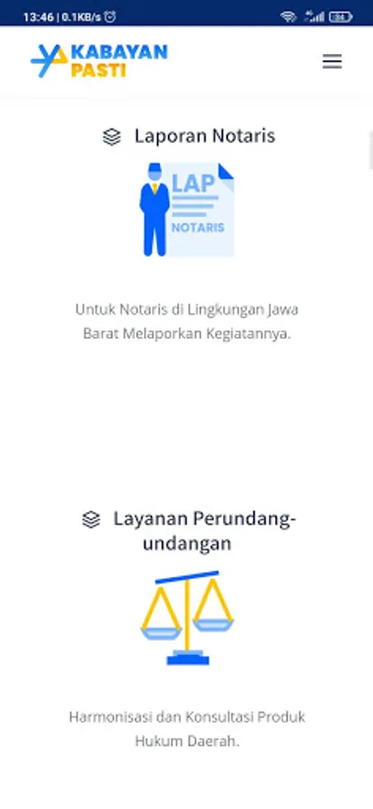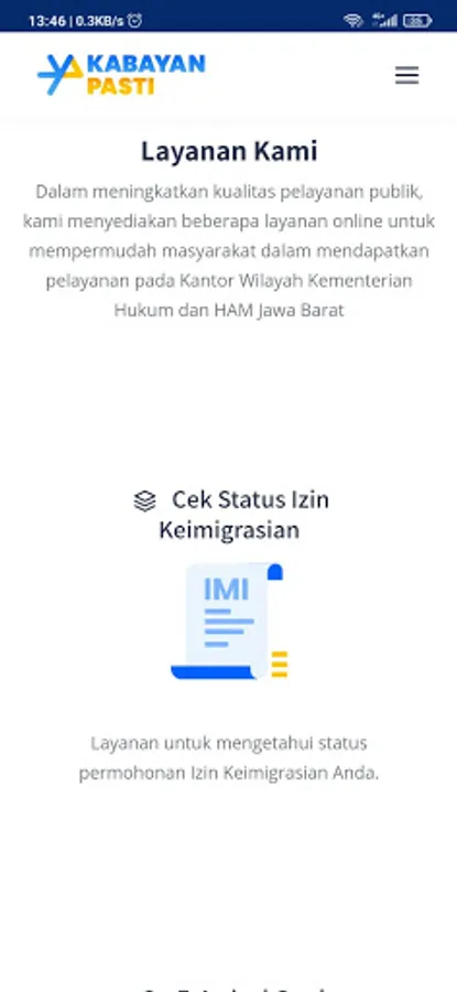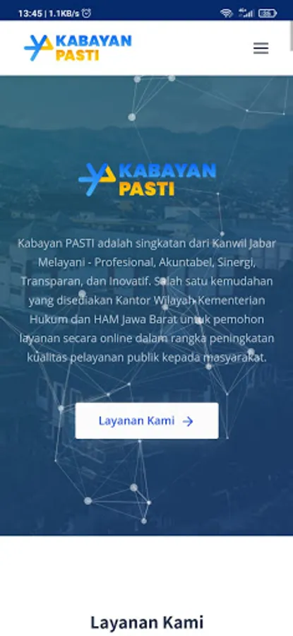 KABAYAN PASTI is an abbreviation of West Java Regional Office Serving - Professional, Accountable, Synergic, Transparent, and Innovative. One of the facilities provided by the Regional Office of the Ministry of Law and Human Rights in West Java for online service applicants is to improve the quality of public services to the community.