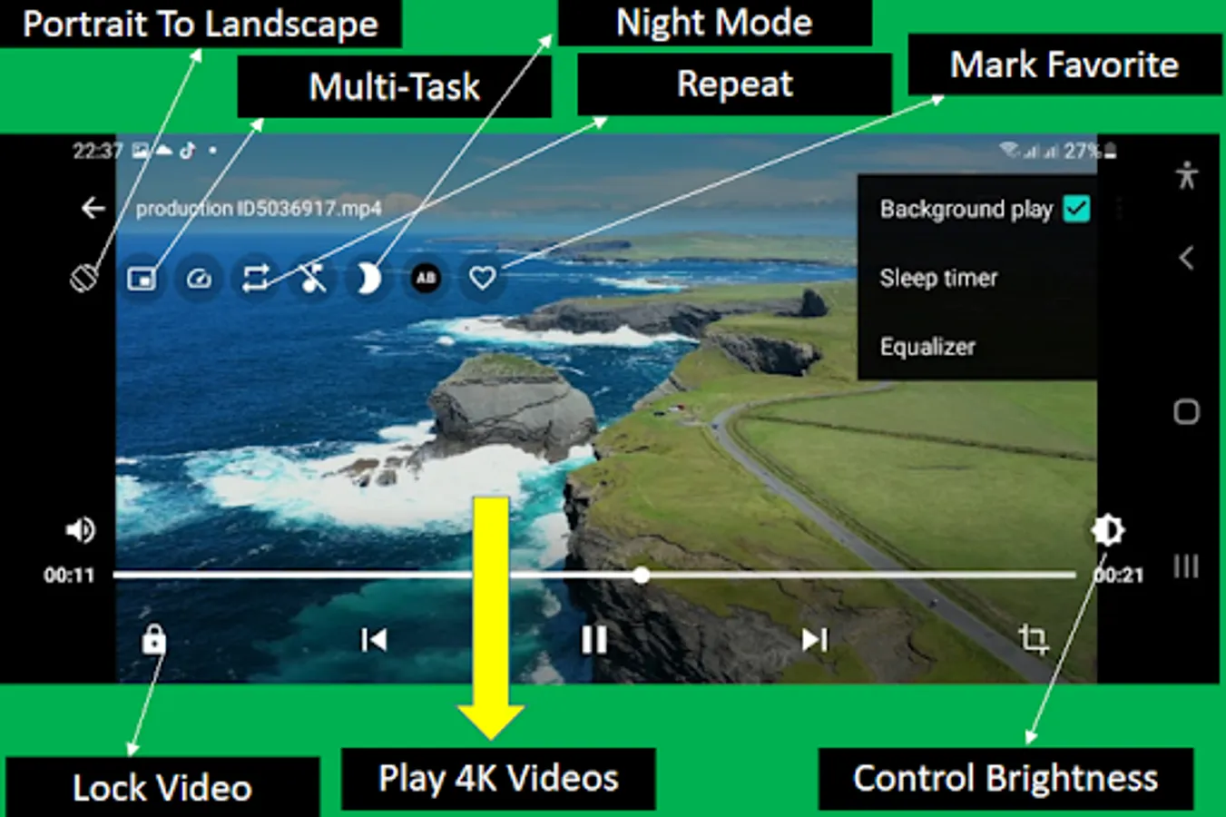 It supports ALL video formats, 4K/ultra Hd video files, and plays them with high-definition.