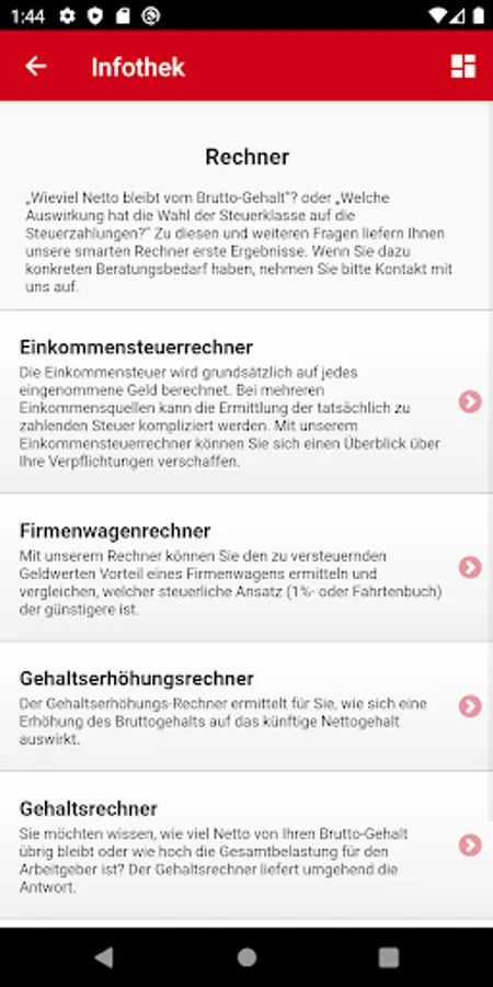 Also on selected tax issues keeps the app information: What is important in running a logbook? What possibilities of tax-privileged content Employee benefits are there? These and other topics provides you with the app the answers.