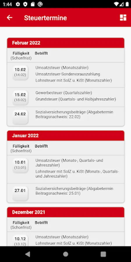You wish to know which tax payment dates pending? Whether as Income or tax prepayment, income tax or business tax - in the app you can find the corresponding dates.