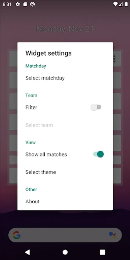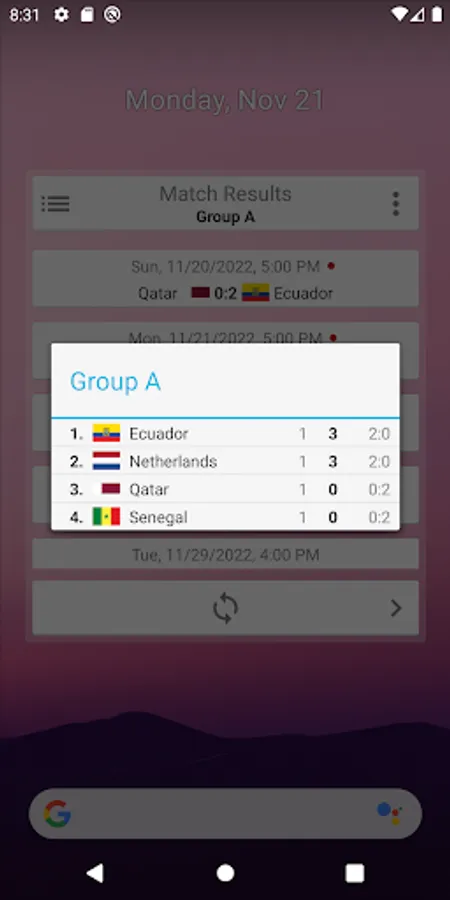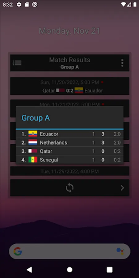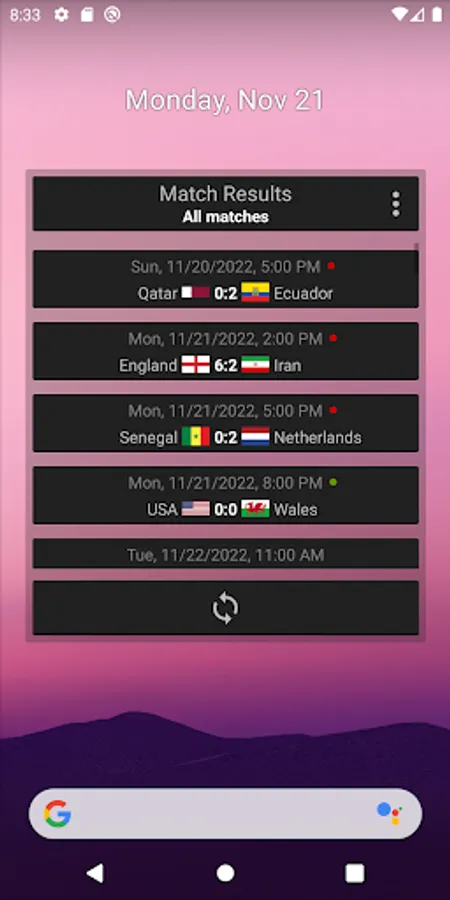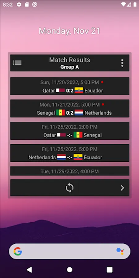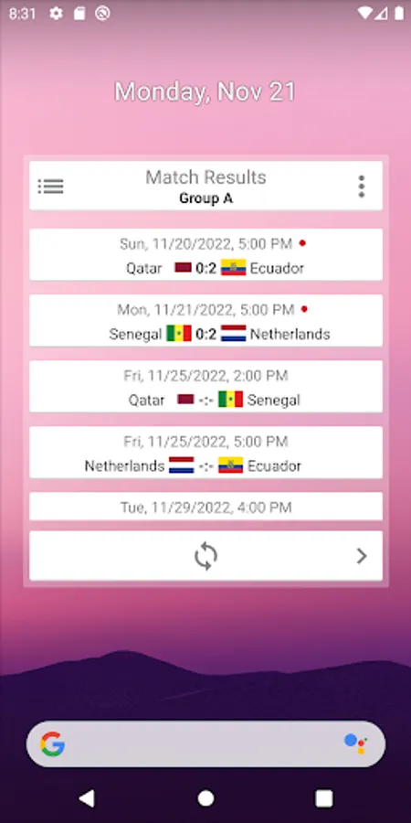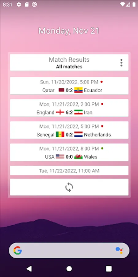 Get the scores of all matches of the soccer world cup right on your home screen. Always up-to-date with just a single click.