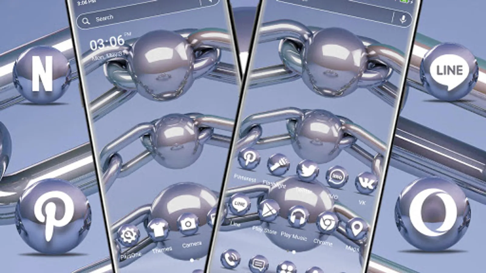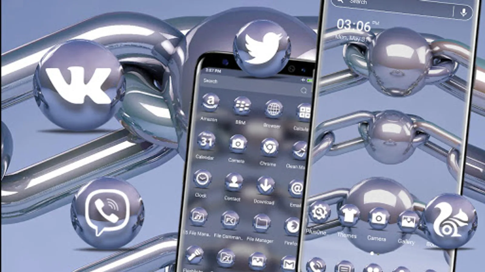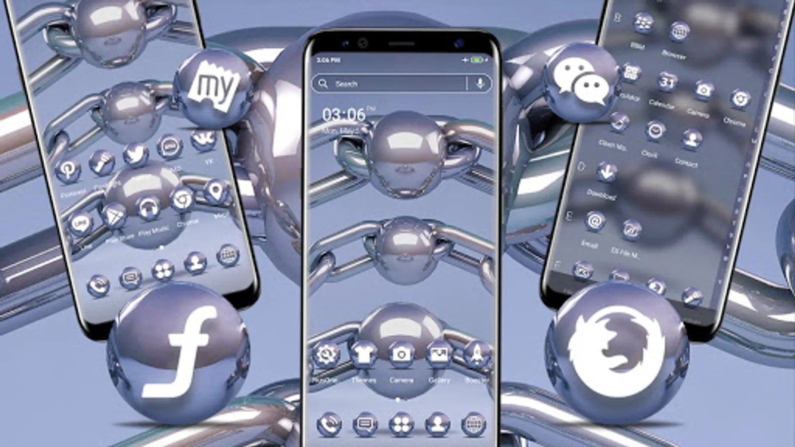 This Metal Chain Ball theme will make your phone look amazing! Begin to appreciate this fantastic new way to customize your computer! Take the Metal silver Ball Theme and get your splendid experience now! Our Silver Chain Ball theme includes a collection of free and perfect trendy and fashion HD wallpapers for you to use to personalize your phone's context.