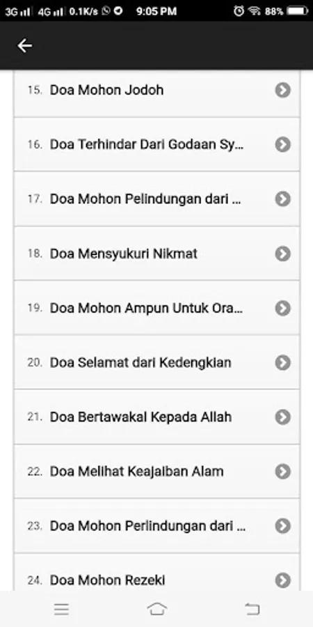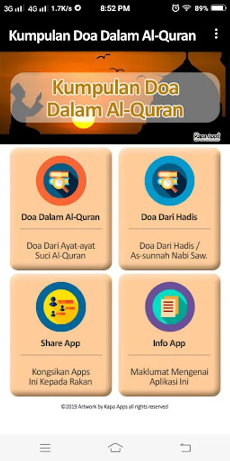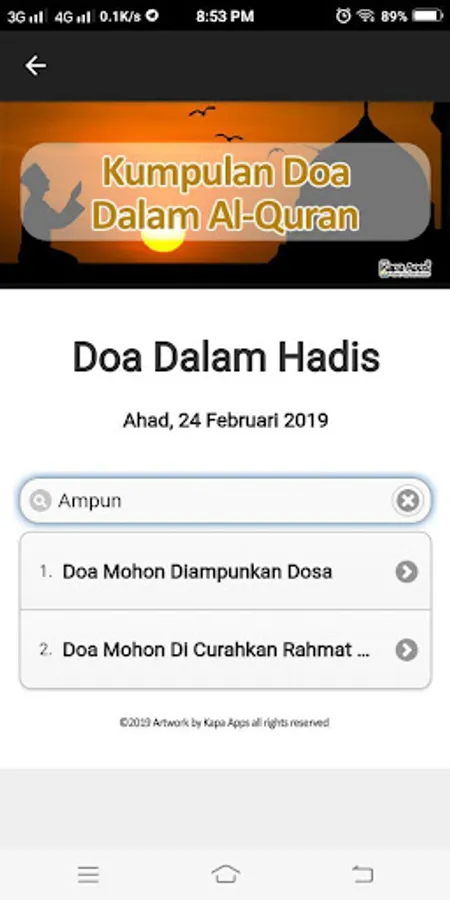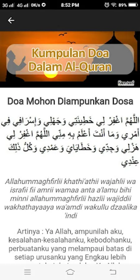 Aplikasi ini memuat Doa Mustajab di Al-Quran dan Hadis untuk Amalan Harian berupa: