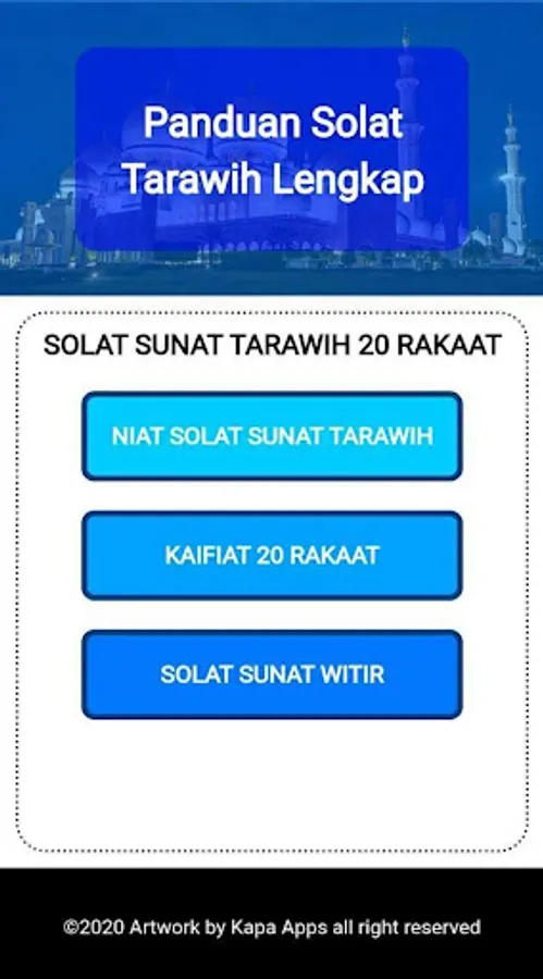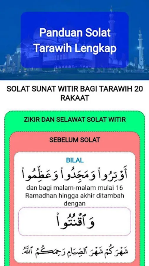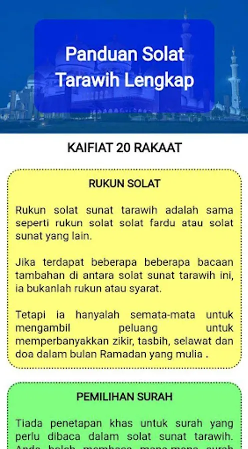 Aplikasi ini menyediakan rujukan dan panduan lengkap untuk mengerjakan Solat Sunat Tarawih sepanjang Ramadhan.