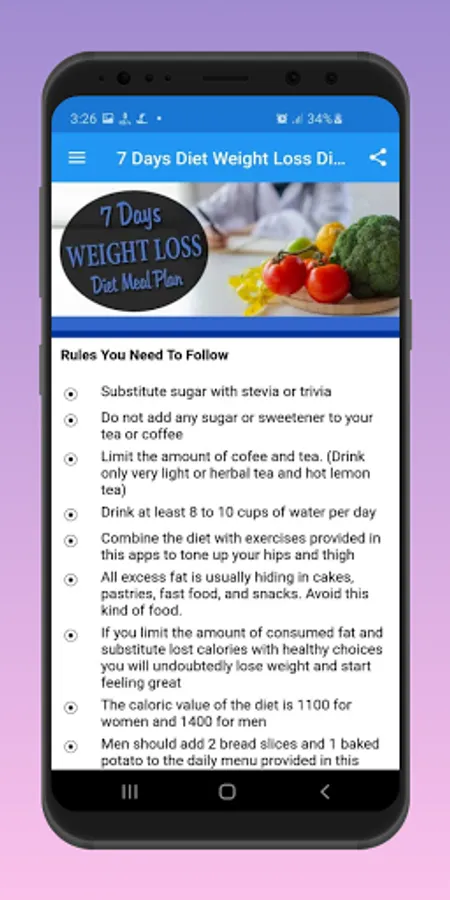 7 Days Weight Loss Diet Meal Plan app is created especially for women who want to lose weight and get rid of unwanted access fat especially in stomach area, the belly fat with no pills. This diet plan also works for men too as to get rid of excess belly fat accumulated over the years!