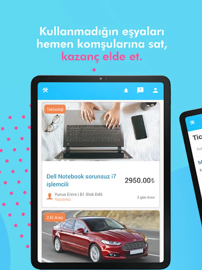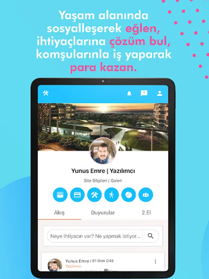 This mobile application, specially developed for you, helps you build a smart and social life from scratch with the new generation technology, and carries the neighborhood life to your pocket. As you click on the door, you meet, mingle, have fun, buy, sell, earn and lead a pleasant life.