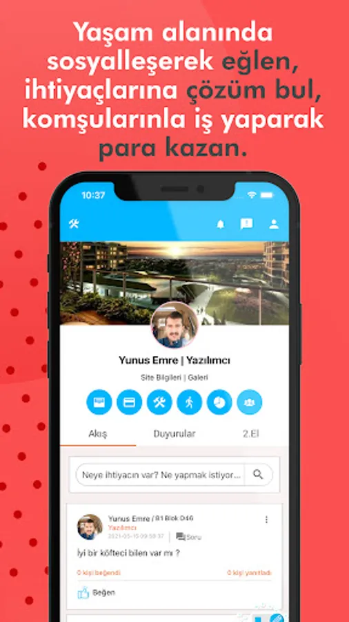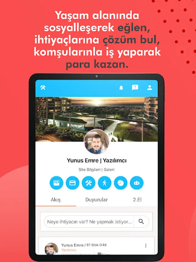 This mobile application, specially developed for you, helps you build a smart and social life from scratch with the new generation technology, and carries the neighborhood life to your pocket. As you click on the door, you meet, mingle, have fun, buy, sell, earn and lead a pleasant life.