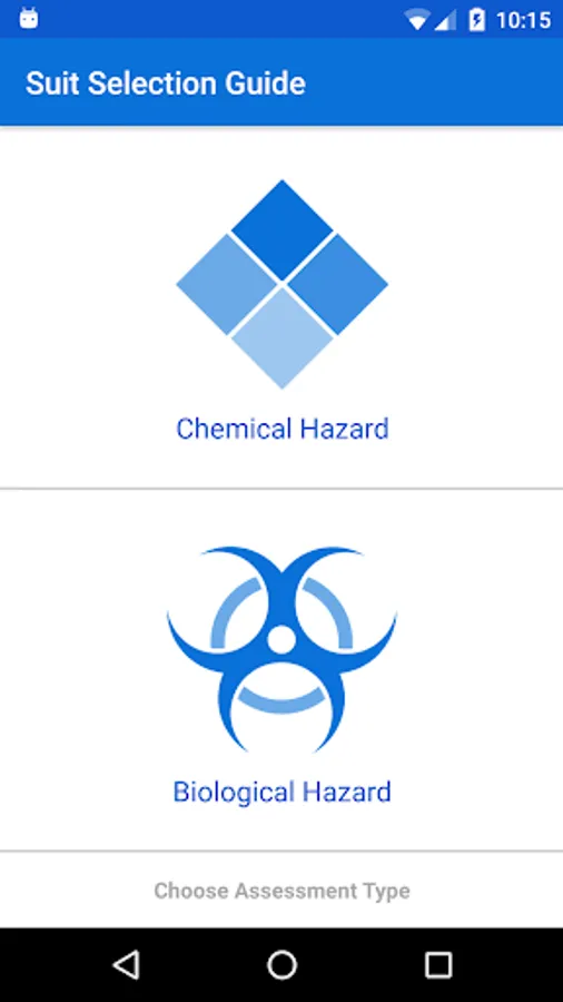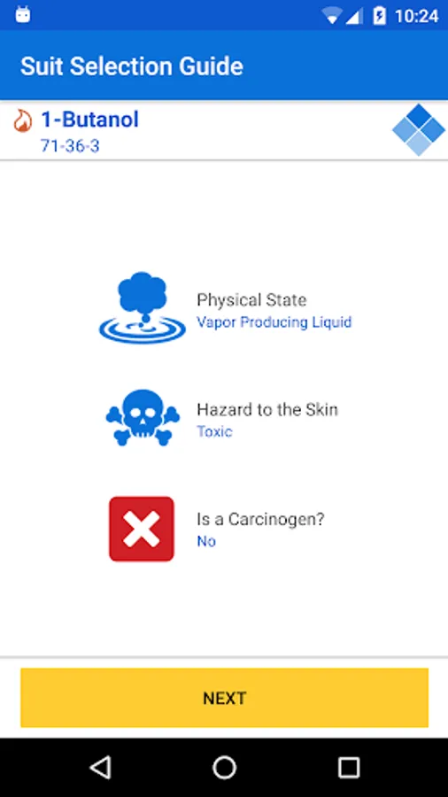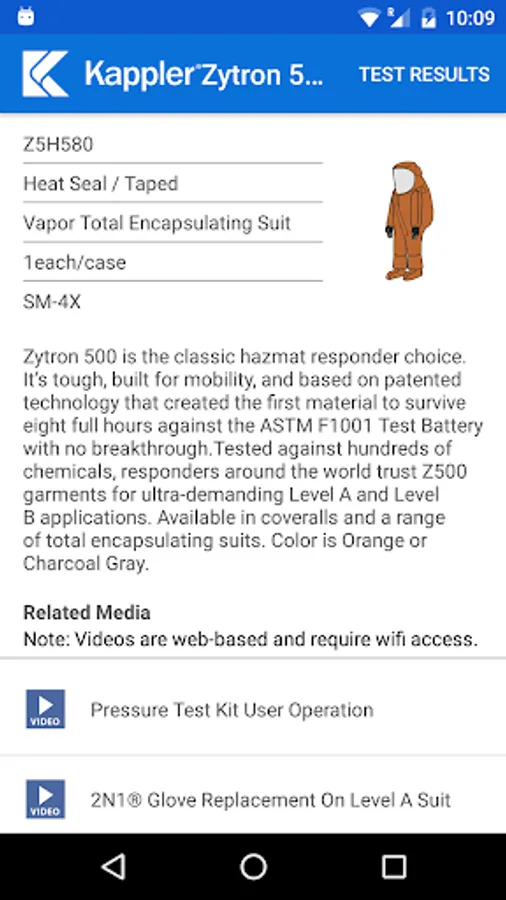 The app contains a database of tested chemicals, searchable by chemical name or CAS number. A user completes a short questionnaire on the hazard situation, and HazMatch recommends a protective garment matching the exposure criteria. Each garment recommendation includes detailed product information.