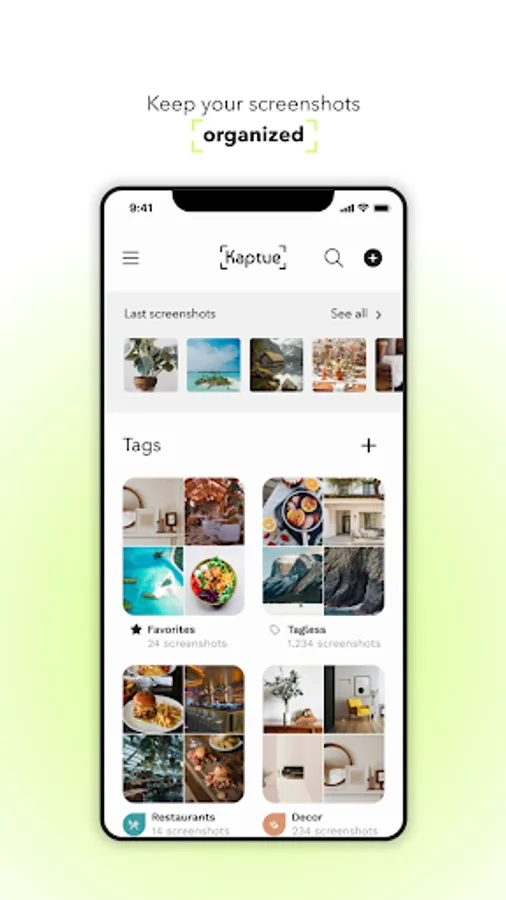 Kaptue helps you to better manage and organize your screenshots and photos, so you don't forget anything. With Kaptue you can sort and search your screenshots quickly and easily.