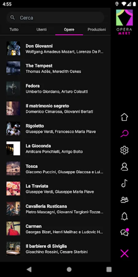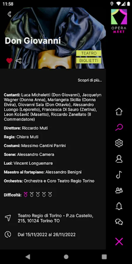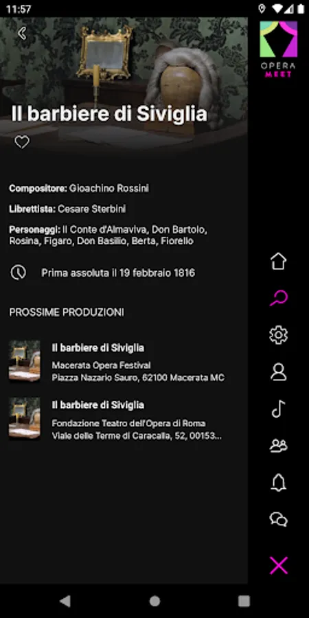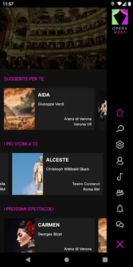 The first community around the world of opera which, using the most modern digital technologies, offers shows in line with the interests of users, schedules the best productions on a national scale and connects with other fans. Meet your friends at the Opera!