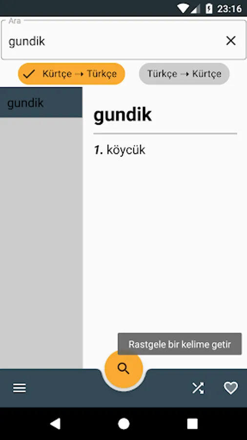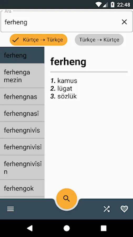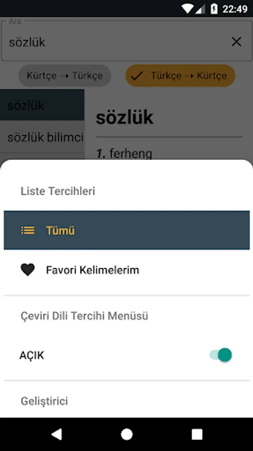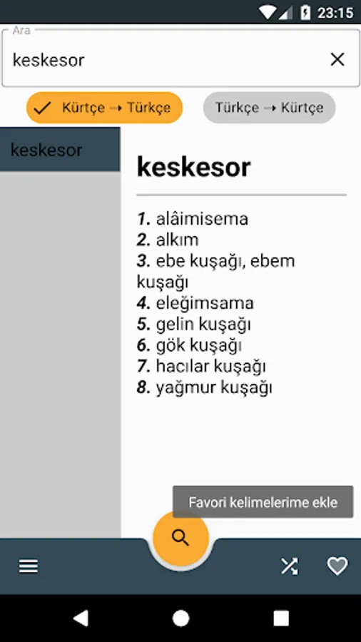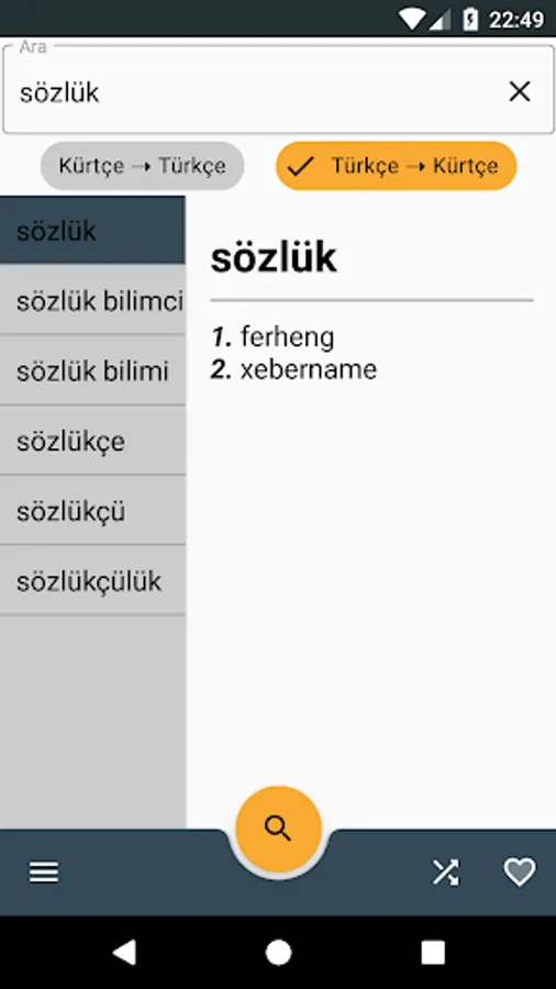 Bu uygulama Kürtçe ve Türkçe dilleri arasında çeviri yapan ücretsiz bir offline(internet gerektirmeyen) sözlük uygulamasıdır. Bu uygulama ile Kürtçe-Türkçe veya Türkçe-Kürtçe dilleri arasında çeviri yapabilirsiniz, kelimeleri favorilerinize ekleyip dilediğiniz zaman favori kelimelerinize erişebilirsiniz. Uygulamanın rastgele kelime getirme özelliğiyle kelime dağarcığınızı geliştirebilirsiniz.