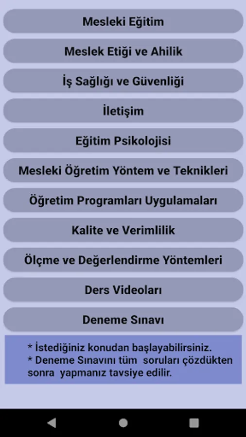 The application consists of 9 modules, lesson videos and practice exams. You can prepare for the Master Teaching Exam by solving the questions in this application.