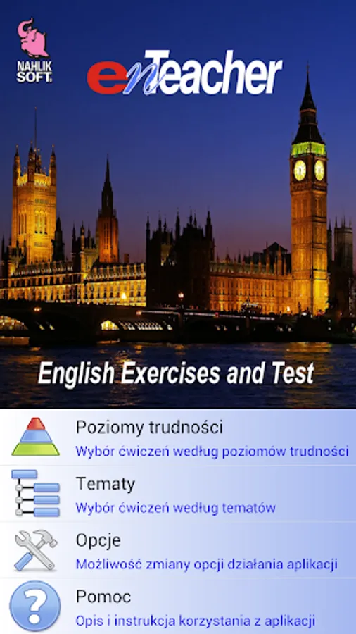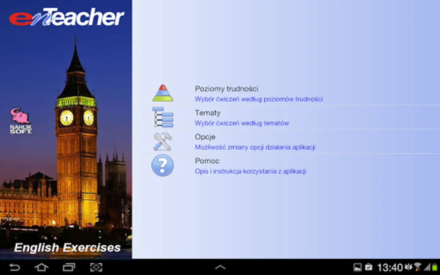 enTeacher is a collection of exercises and tests for learning and improving English language on different difficulty levels. You can learn new words, correct usage of words in various contexts, grammar and use of English in various situations.