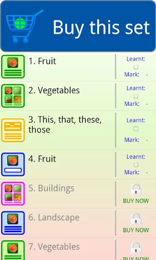 There are 6 types of exercises. Each type is represented by a different look of icons: