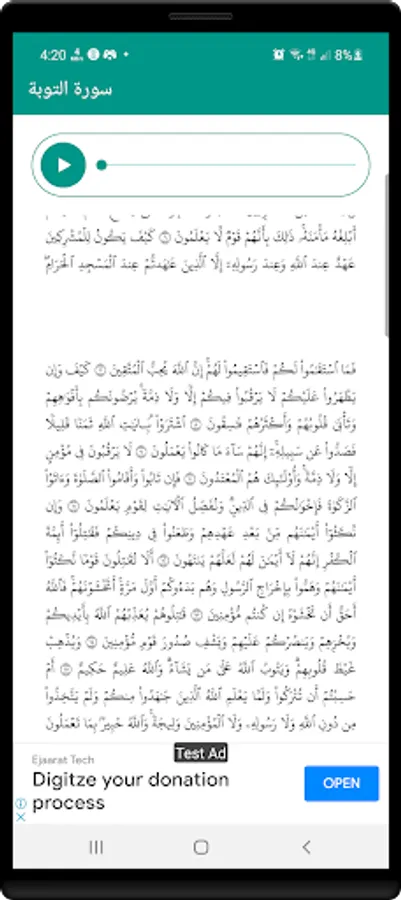 Surat Al-Tawbah by Sheikh Al-Sudais is audible with the ability to read the written image